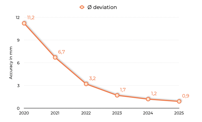 Since we built our first prototype in 2020, our measuring accuracy has improved massively. The first tests with our AI were still relatively sobering, with a measurement deviation of 11.2 mm, this is a deviation of 2 whole shoe sizes (depending on the size system) - which is of course completely unusable. However, we were not discouraged and continued to develop with a great deal of passion and diligence. After thousands of hours of development and another 100,000 feet measured and scanned, we have brought the performance of our AI to millimeter accuracy. And the best thing is that we are nowhere near the end. We continue to train our AI with every scan.